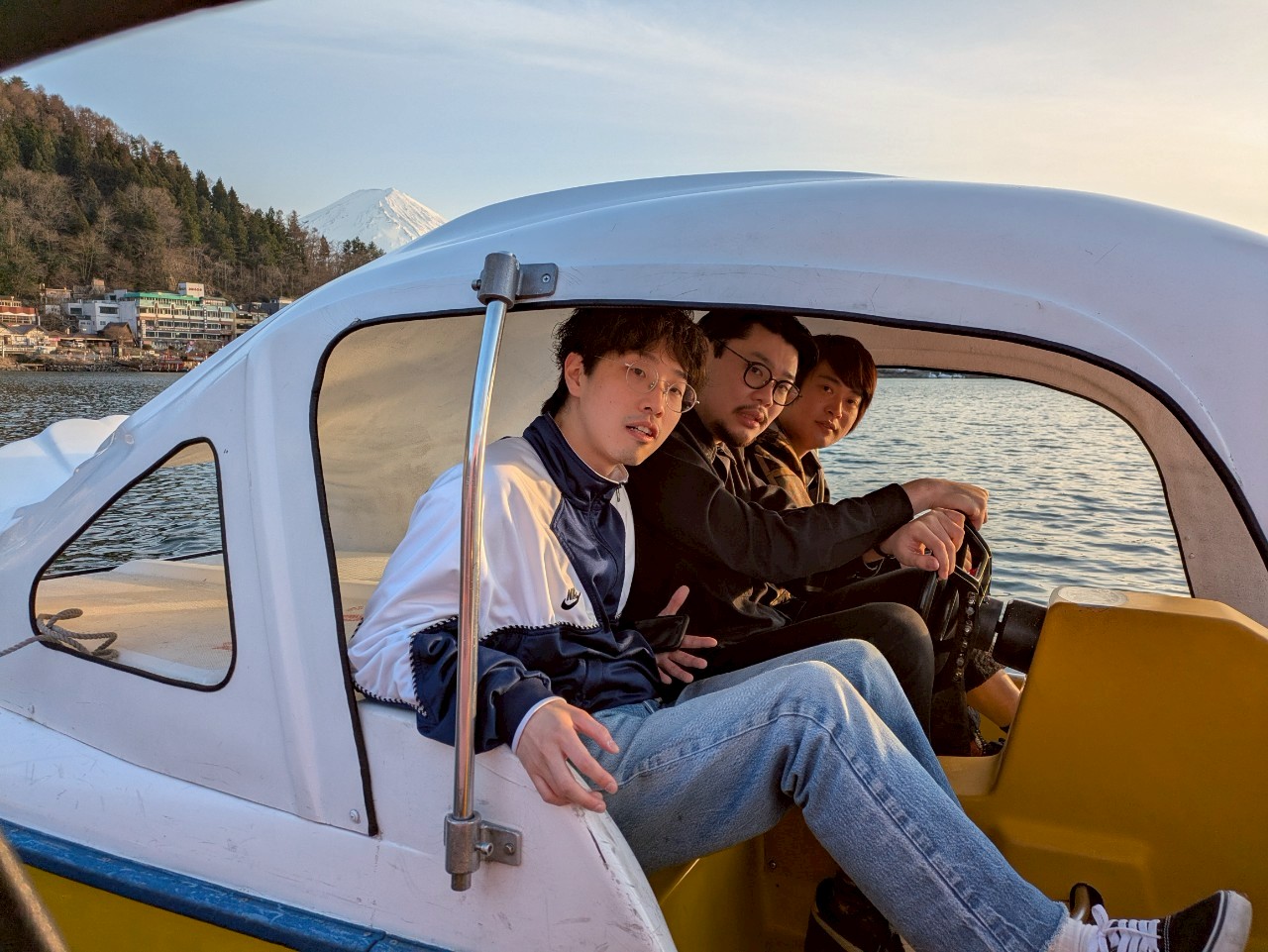 写真映えするレジャーを体験せよ!というミッションのもと、スワンボートを楽しむ、オフローズ・明賀、定点計画・司場、ザンゾウ・タヨリ