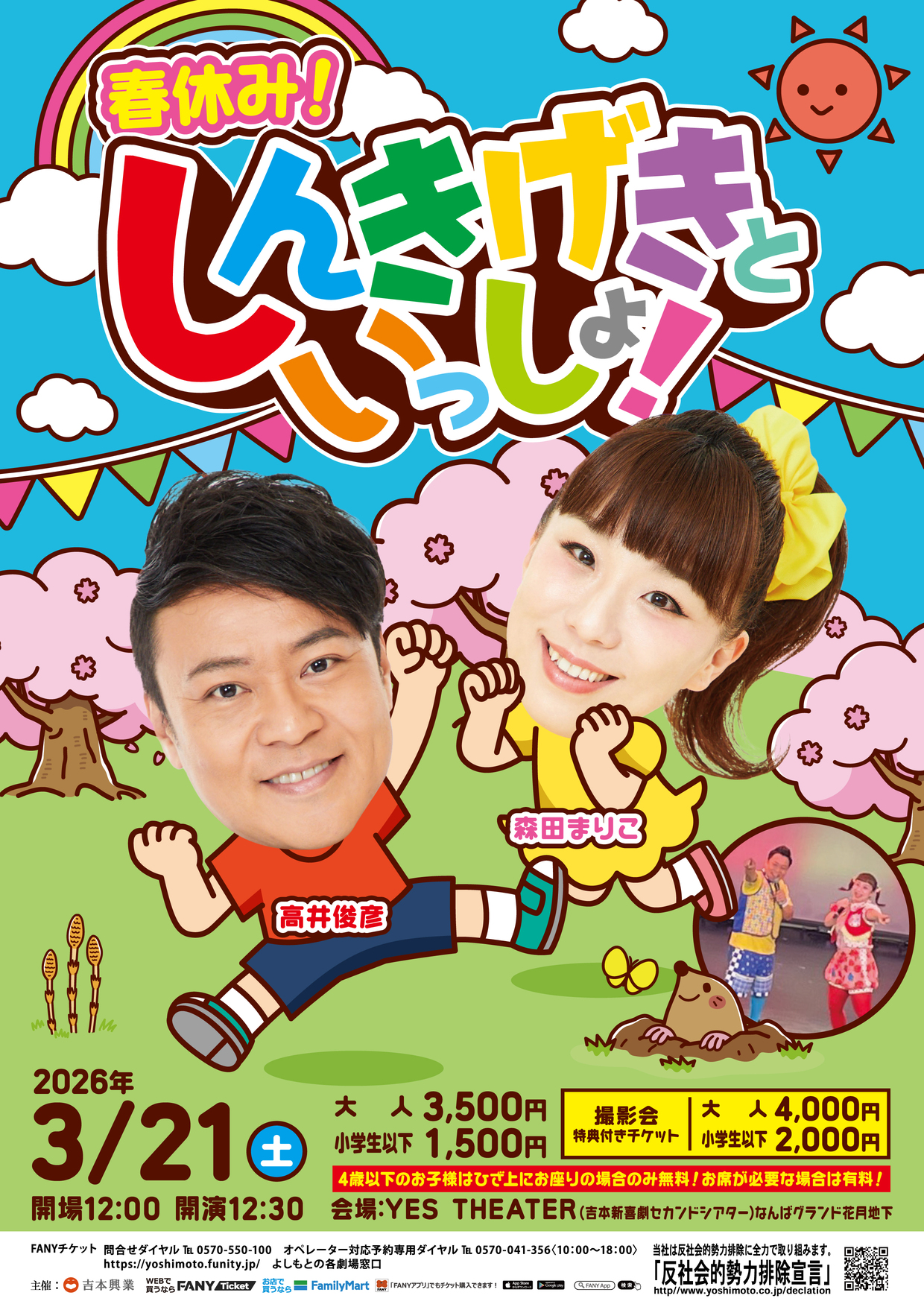 「しんきげきといっしょ」は、『親子で笑って遊べる』をコンセプトにした、小さなお子様連れでも安心して楽しめるファミリー向けの特別公演です。名前の通り、通常の本公演よりもお子様が主役になれる工夫をした公演になっております。また、歌やダンスが盛りだくさん 新喜劇のメンバーと一緒に歌ったり踊ったりするシーンもあり、お子様が楽しめる公演になってます!